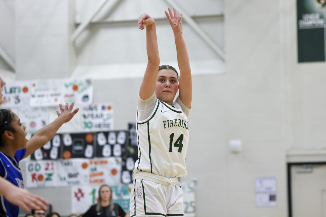 Free State freshman Quinlynn Vail takes a shot during the Firebirds’ game against Olathe West on Friday, Feb. 6, 2026, at Free State High School in Lawrence.
