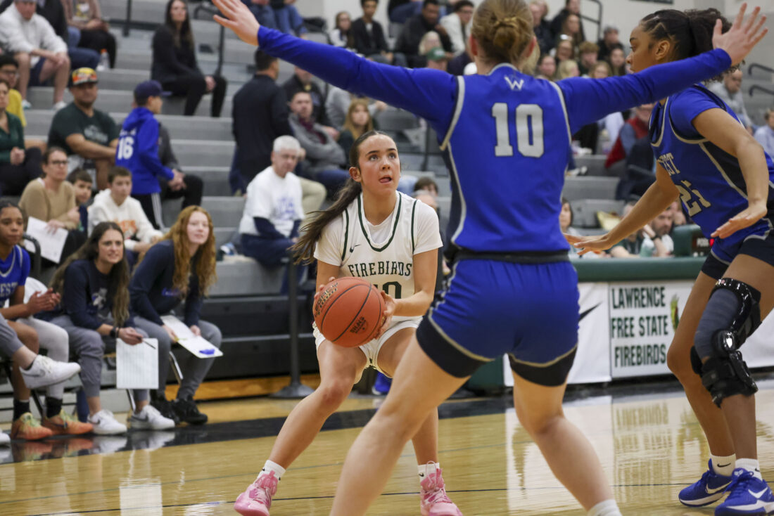 Free State freshman Morgan McClorey goes around a screen during the Firebirds’ game against Olathe West on Friday, Feb. 6, 2026, at Free State High School in Lawrence.