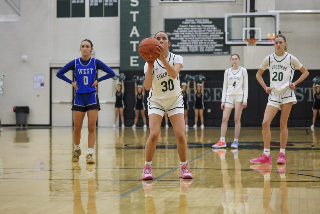 Free State freshman Morgan McClorey shoots a free throw during the Firebirds’ game against Olathe West on Friday, Feb. 6, 2026, at Free State High School in Lawrence.
