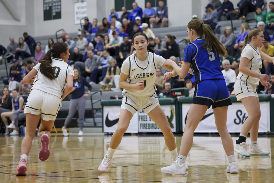 Free State sophomore Addi Hothan defends during the Firebirds’ game against Olathe West on Friday, Feb. 6, 2026, at Free State High School in Lawrence.