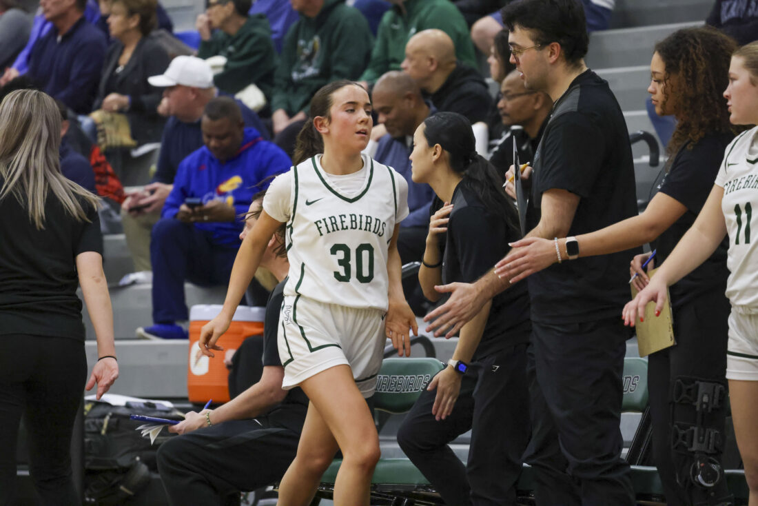 Free State freshman Morgan McClorey high-fives staff members on the bench during the Firebirds’ game against Olathe West on Friday, Feb. 6, 2026, at Free State High School in Lawrence.