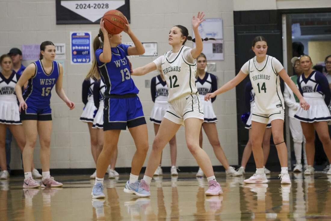 Free State senior Addie Fulscher defends during the Firebirds’ game against Olathe West on Friday, Feb. 6, 2026, at Free State High School in Lawrence.
