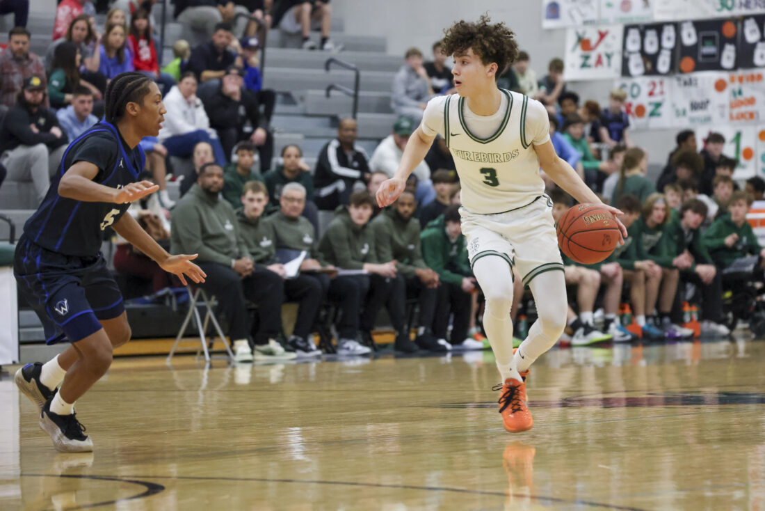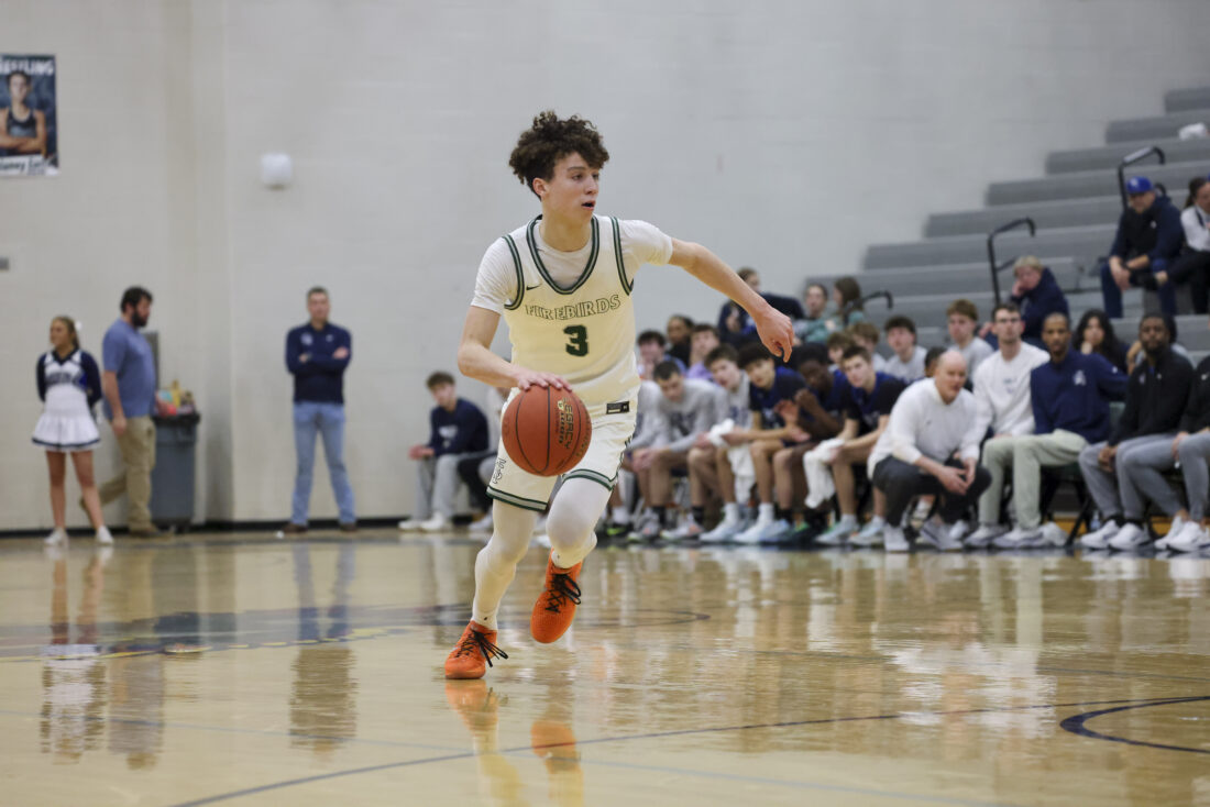 Free State senior Bennett Nagel brings the ball past halfcourt during the Firebirds’ game against Olathe West on Friday, Feb. 6, 2026, at Free State High School in Lawrence.