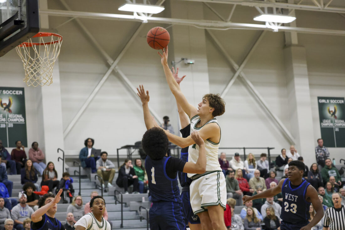 Free State senior Bennett Nagel goes up for a floater during the Firebirds’ game against Olathe West on Friday, Feb. 6, 2026, at Free State High School in Lawrence.