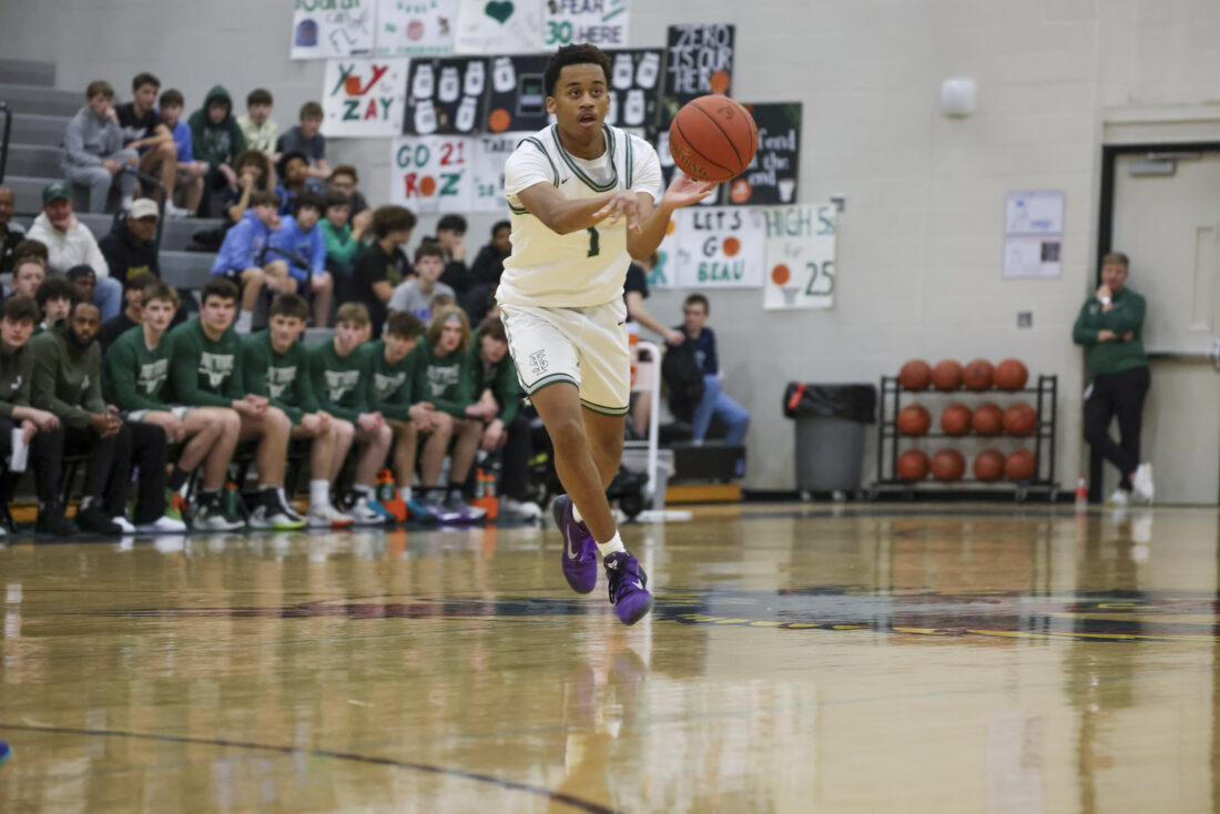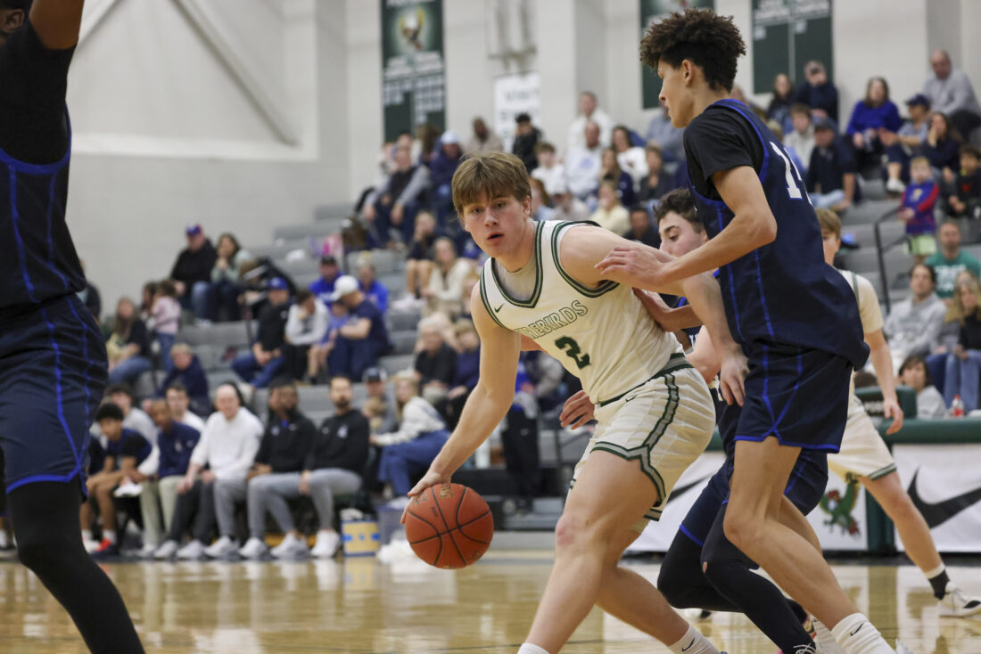 Free State senior Ethan Prescott looks for space during the Firebirds’ game against Olathe West on Friday, Feb. 6, 2026, at Free State High School in Lawrence.