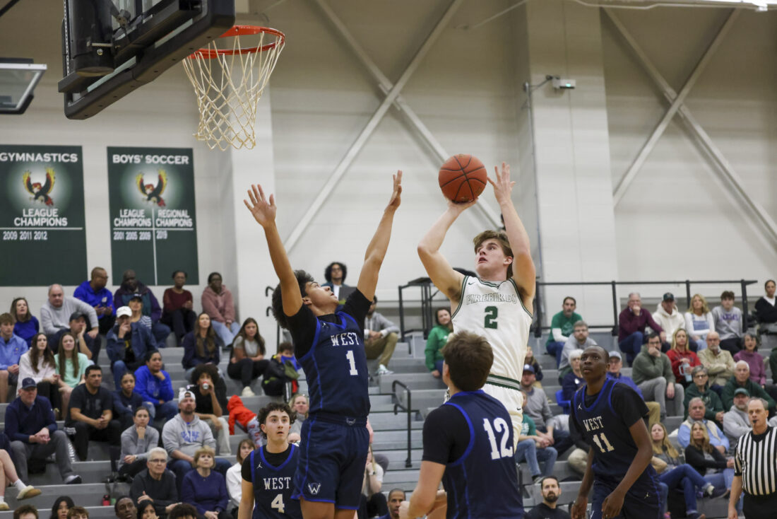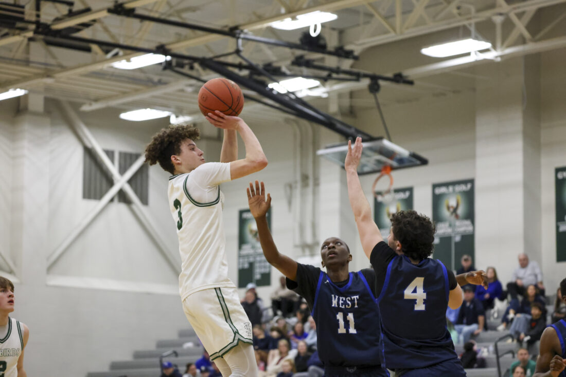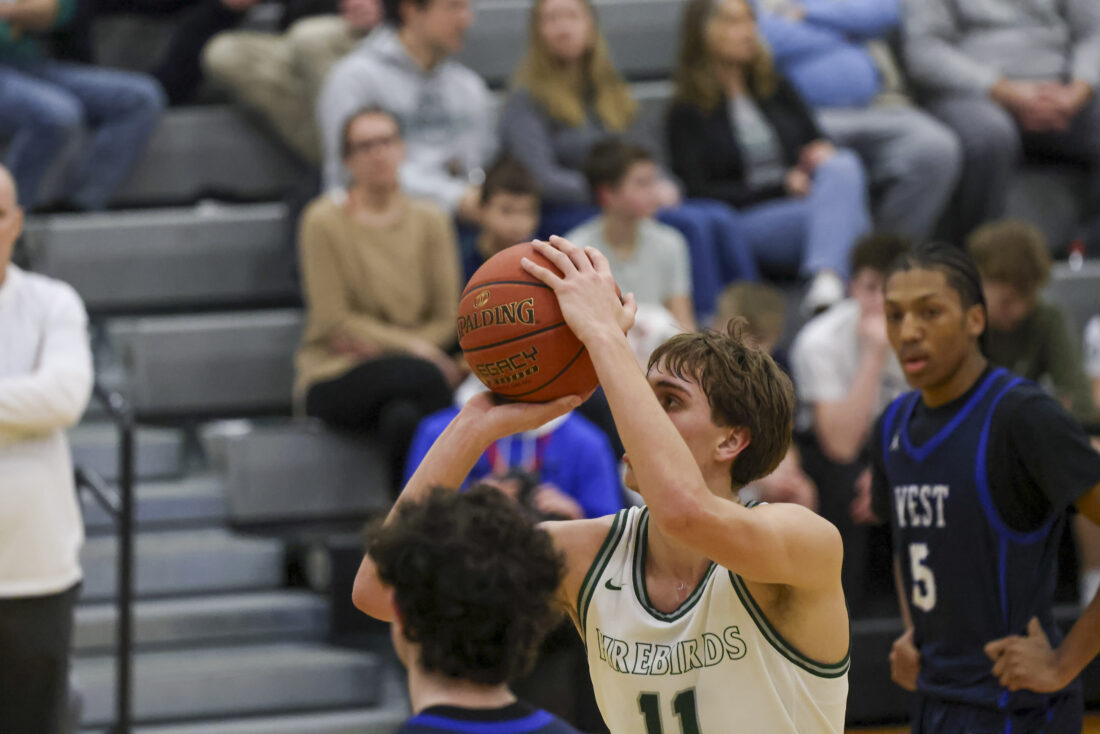 Free State sophomore Brendan Barrett rises up for a shot during the Firebirds’ game against Olathe West on Friday, Feb. 6, 2026, at Free State High School in Lawrence.