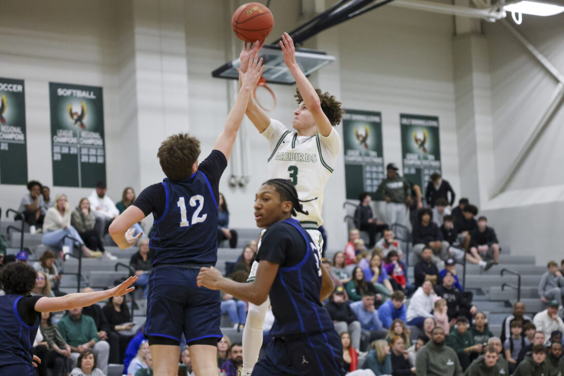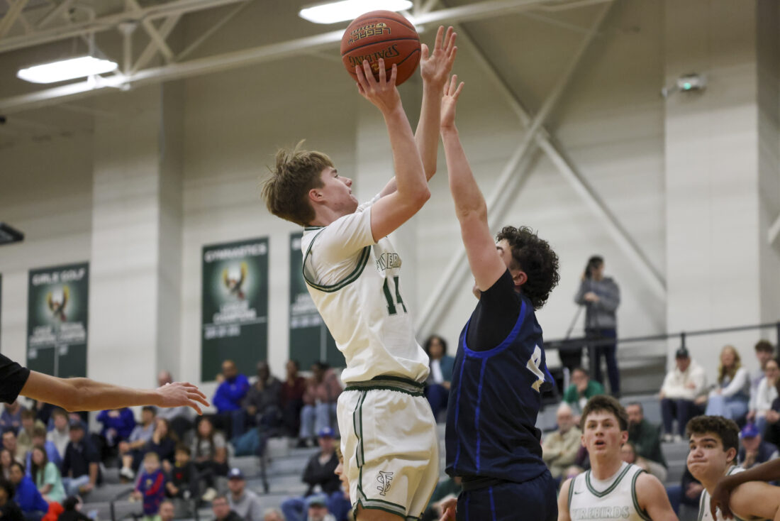 Free State senior Ethan Prescott fades away while putting up a shot during the Firebirds’ game against Olathe West on Friday, Feb. 6, 2026, at Free State High School in Lawrence.