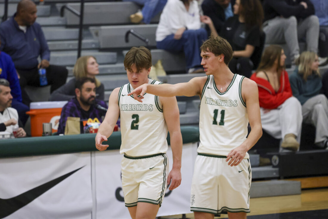 Free State seniors Ethan Prescott (2) and Bennett Nagel share a chat while heading back onto the court during the Firebirds’ game against Olathe West on Friday, Feb. 6, 2026, at Free State High School in Lawrence.