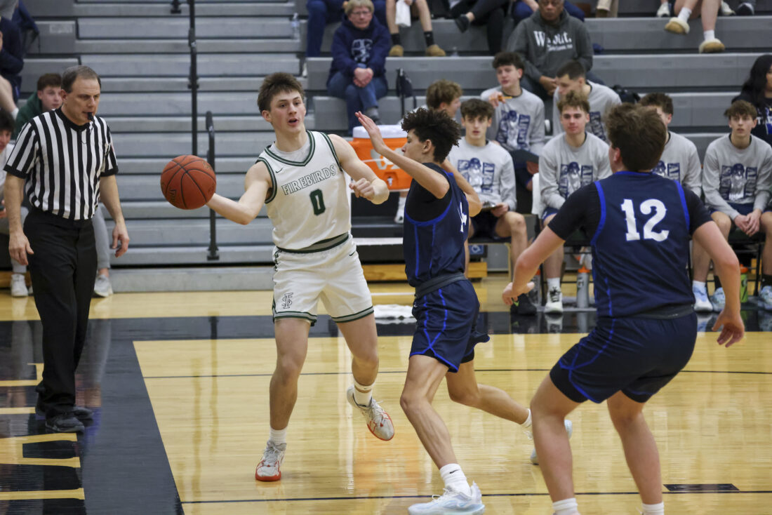 Free State sophomore Brendan Barrett looks for an open teammate during the Firebirds’ game against Olathe West on Friday, Feb. 6, 2026, at Free State High School in Lawrence.