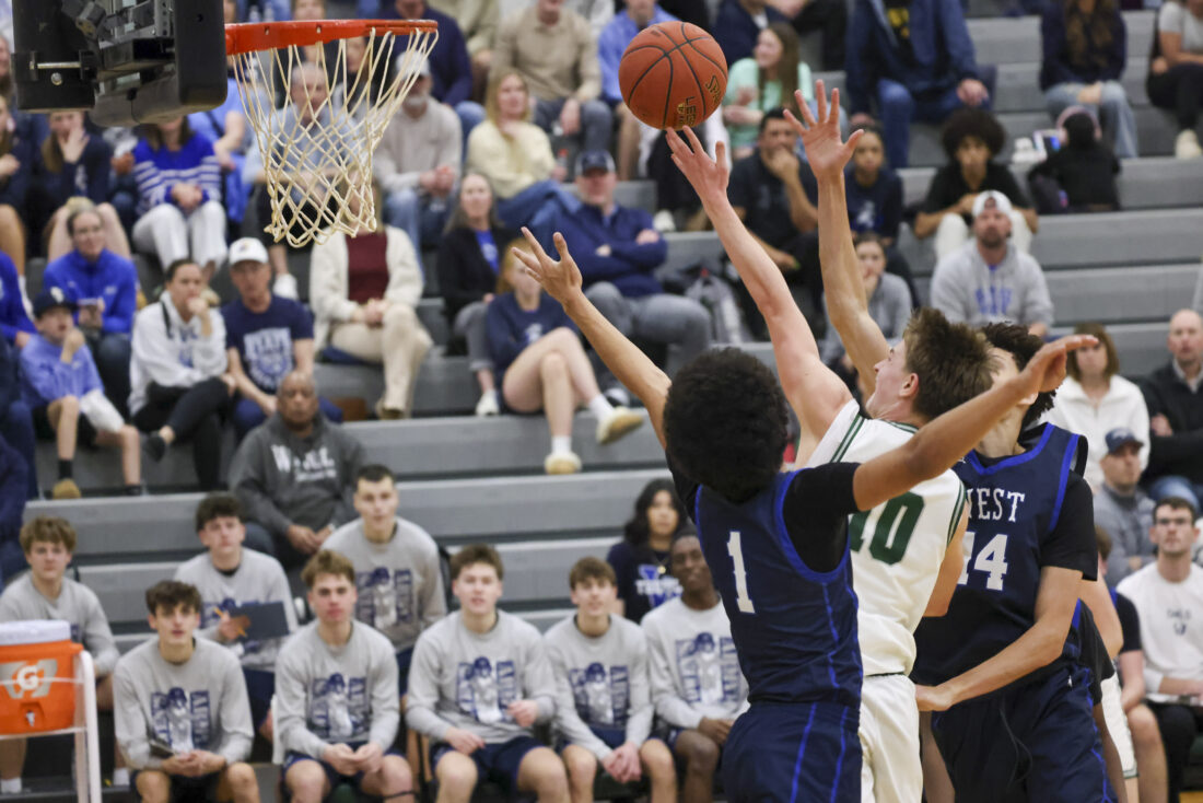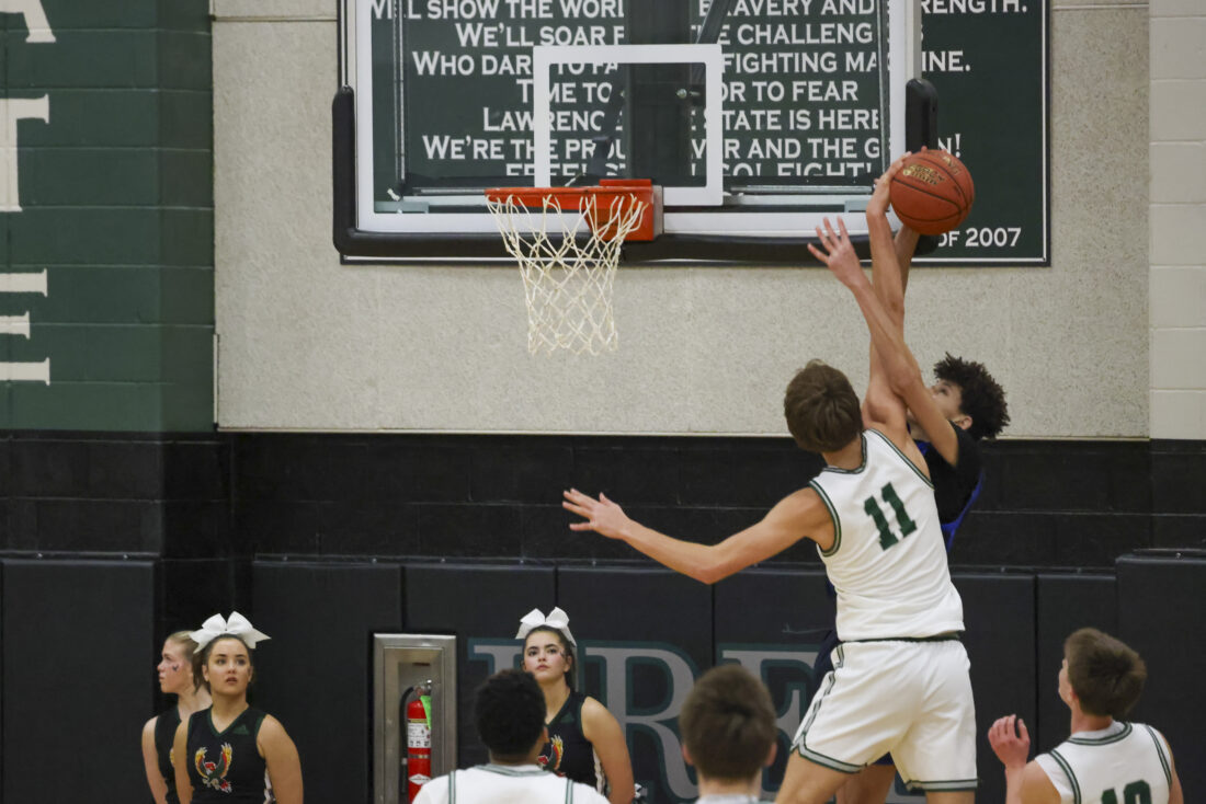 Free State junior Owen Garber goes up for a contested shot during the Firebirds’ game against Olathe West on Friday, Feb. 6, 2026, at Free State High School in Lawrence.