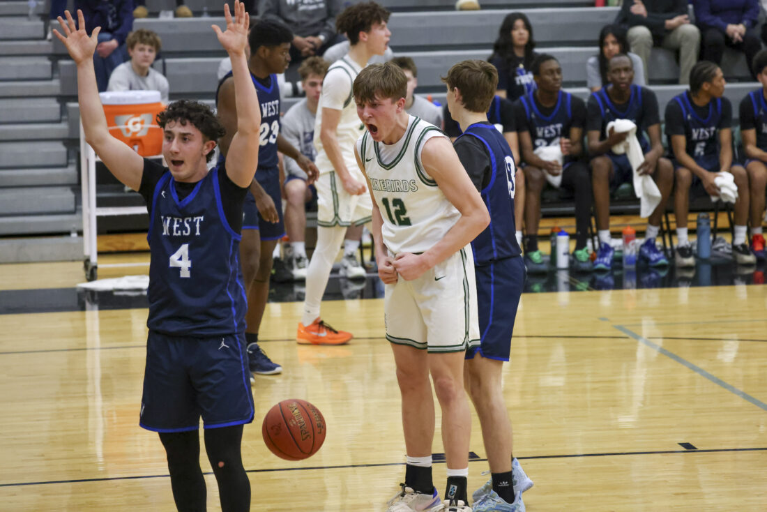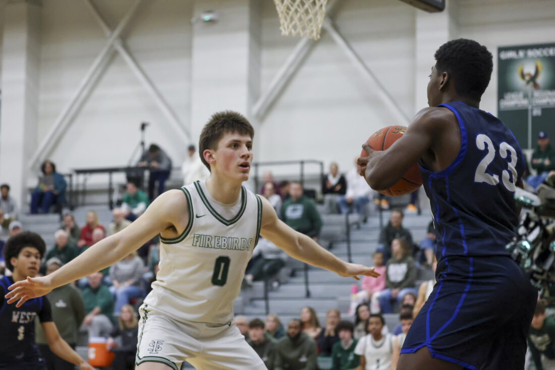Free State freshman Packson McDaniel defends an inbound pass late in the Firebirds’ game against Olathe West on Friday, Feb. 6, 2026, at Free State High School in Lawrence.