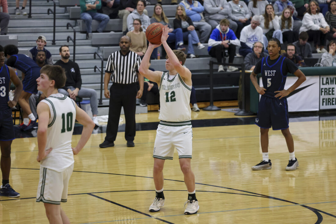 Free State freshman Packson McDaniel watches a free throw during the Firebirds’ game against Olathe West on Friday, Feb. 6, 2026, at Free State High School in Lawrence.