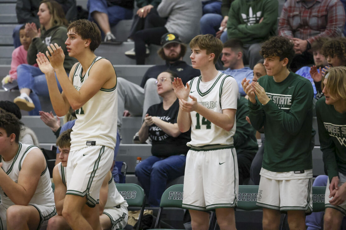 Free State senior Bennett Nagel celebrates on the sideline during the Firebirds’ game against Olathe West on Friday, Feb. 6, 2026, at Free State High School in Lawrence.