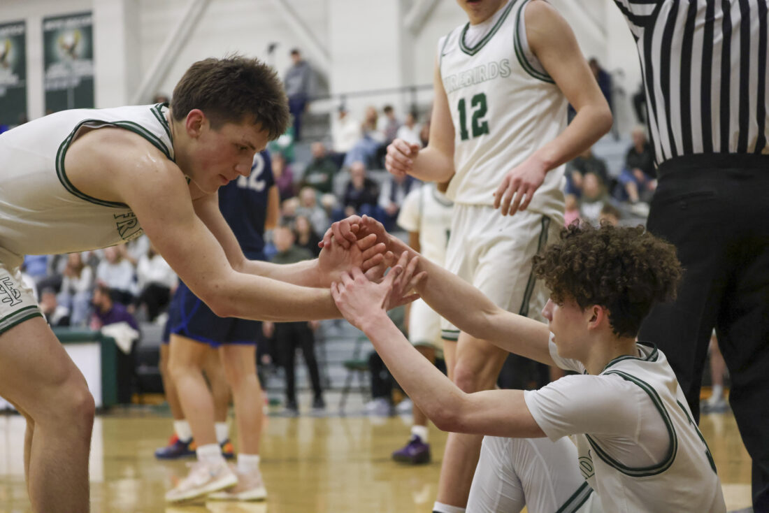 Free State freshman Packson McDaniel (left) helps up sophomore Brendan Barrett during the Firebirds’ game against Olathe West on Friday, Feb. 6, 2026, at Free State High School in Lawrence.