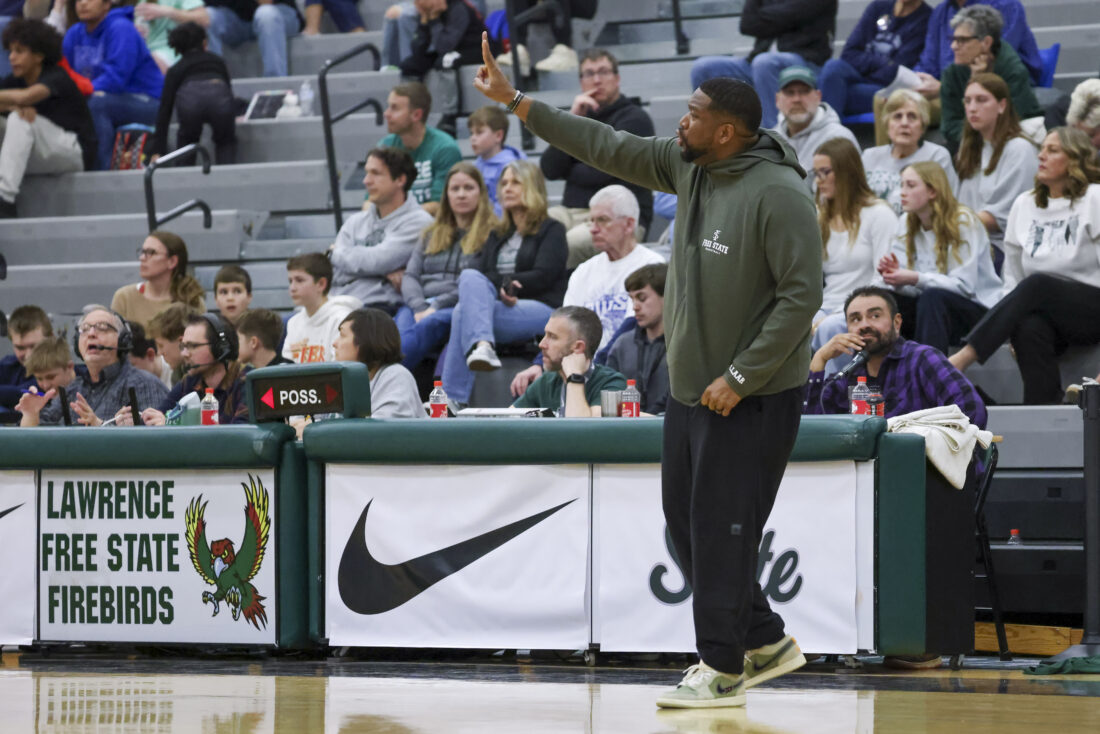 Free State head coach Dwayne Paul calls out a play to his team during the Firebirds’ game against Olathe West on Friday, Feb. 6, 2026, at Free State High School in Lawrence.