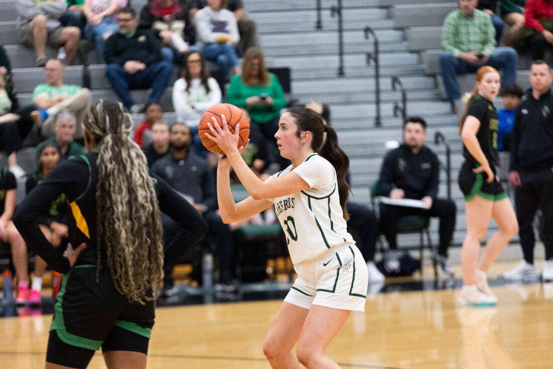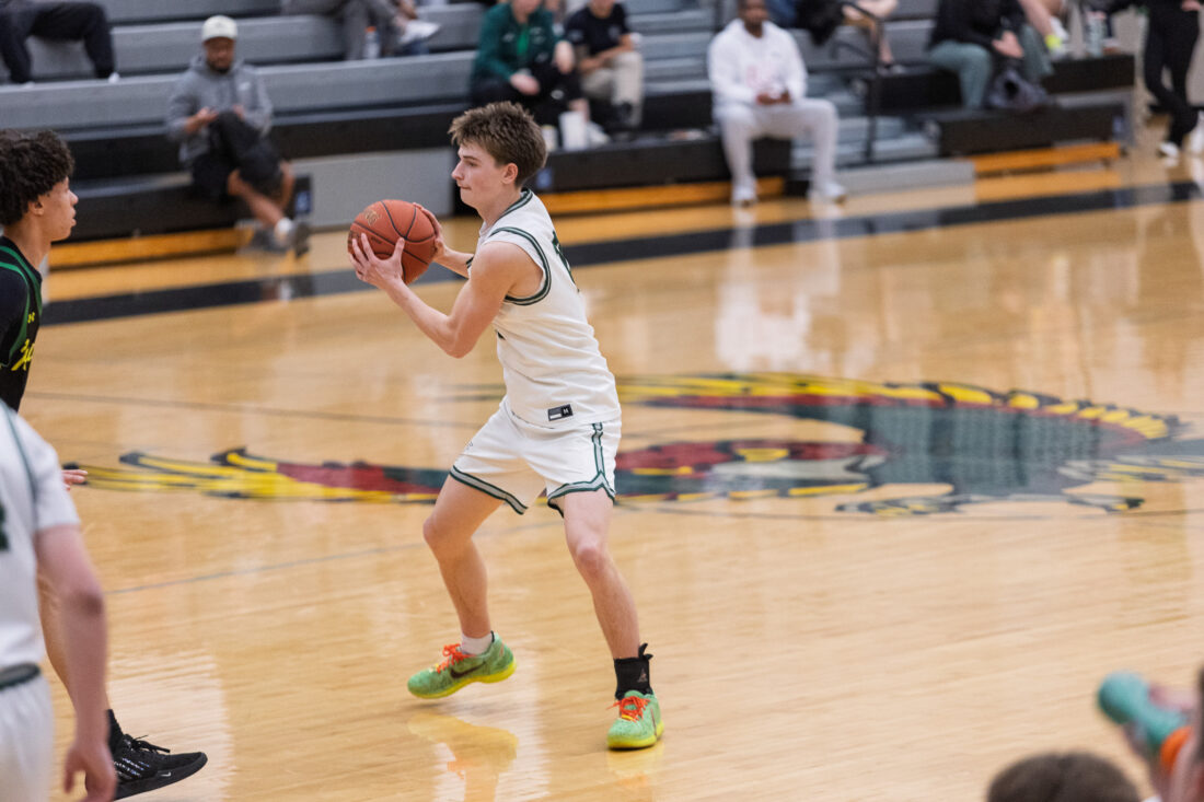 Free State senior Jaden Clock holds the ball while looking for a teammate to pass the ball to against Shawnee Mission South at Free State High on Friday, Feb. 13, 2026.