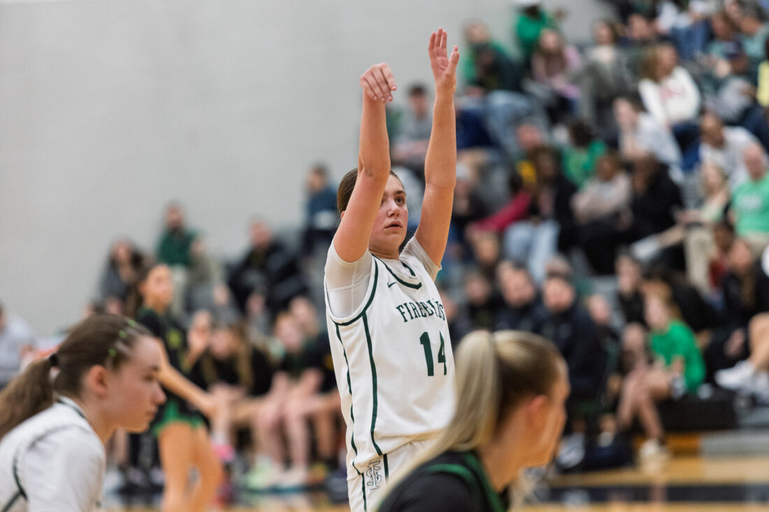 Free State senior guard Addie Fulscher shoots a 3-pointer while playing against Shawnee Mission South at Free State High on Friday, Feb. 13, 2026.