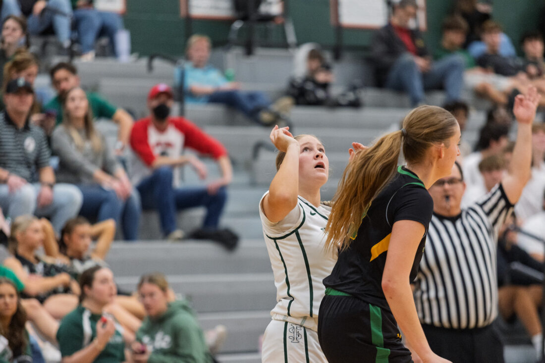 Free State freshman guard Morgan McClorey watches her layup go in the basket while playing against Shawnee Mission South at Free State High on Friday, Feb. 13, 2026.