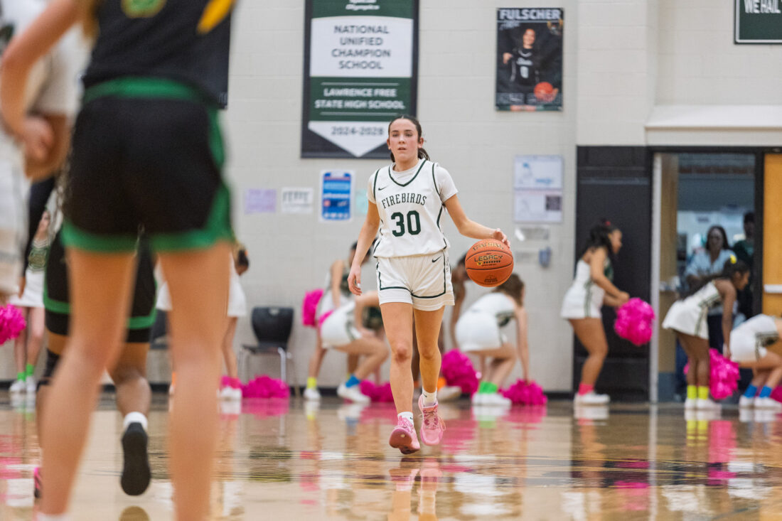 Free State freshman guard Morgan McClorey dribbles down the court while playing against Shawnee Mission South at Free State High on Friday, Feb. 13, 2026.