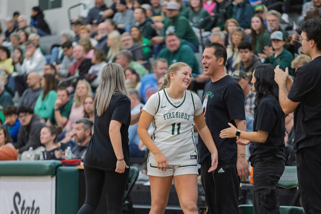 Free State senior guard Libby Easter laughs as she steps off the court during her final home game as a Firebird while playing against Shawnee Mission South at Free State High on Friday, Feb. 13, 2026.