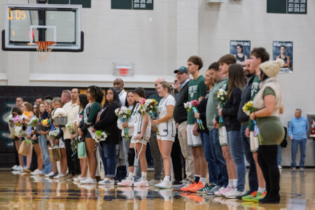 The two seniors on the Free State girls basketball team line up on the court at Free State High during their senior night ceremony on Friday, Feb. 13, 2026.