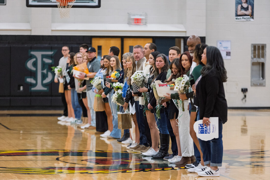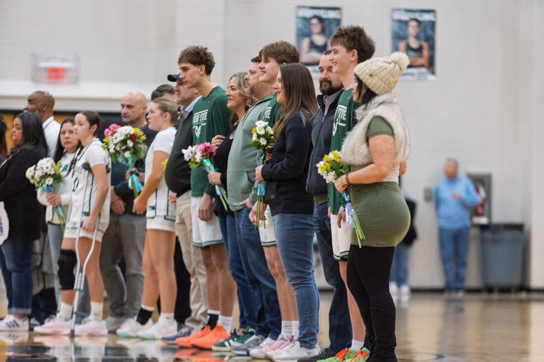 Free State boys and girls basketball seniors as well as dance and cheer seniors line up on the court at Free State High during senior night on Friday, Feb. 13, 2026.