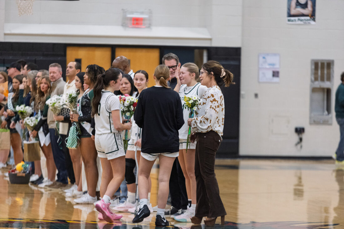 Free State girls basketball senior Libby Easter is greeted by teammates at Free State High during the senior night ceremony on Feb. 13, 2026.