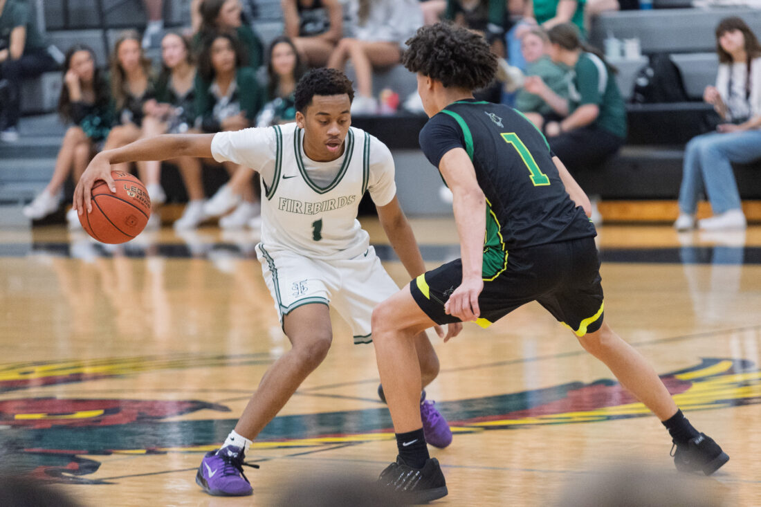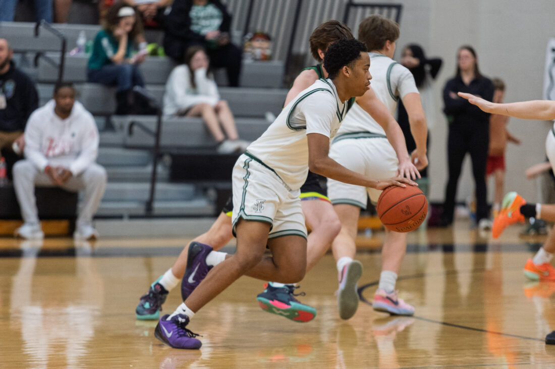 Free State sophomore Jayden Williams drives past Shawnee Mission South defense while playing at Free State High on Friday, Feb. 13, 2026.