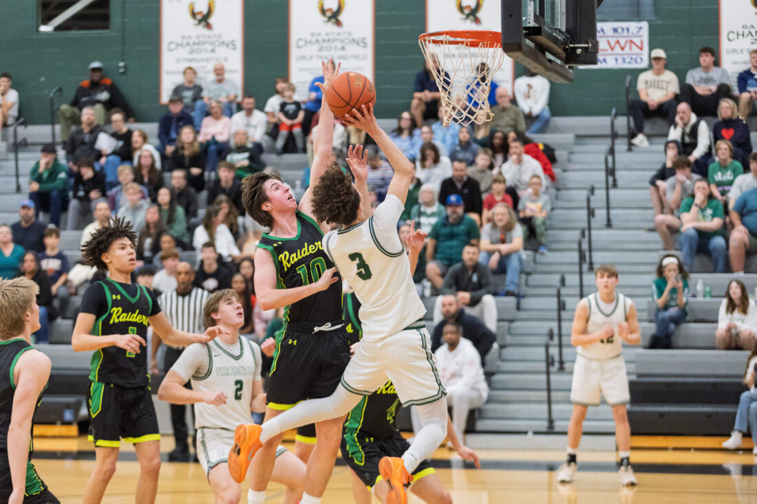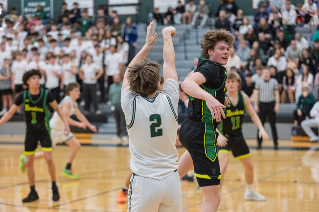 Free State sophomore Brendan Barrett shoots over a Shawnee Mission South defender at Free State High on Friday, Feb. 13, 2026.