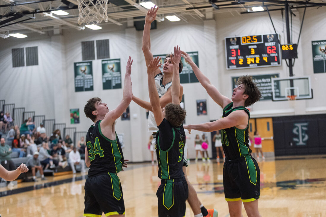 Free State senior Bennett Nagel shoots over three Shawnee Mission South defenders at Free State High on Friday, Feb. 13, 2026.