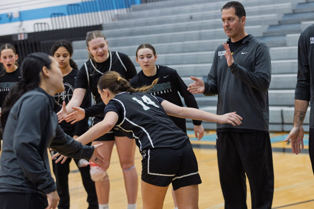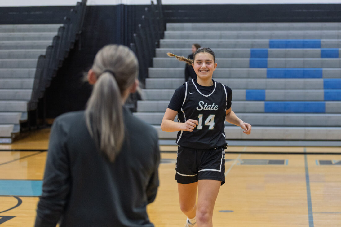 Free State freshman guard Quinlynn Vail greets her coach during player introductions at Shawnee Mission East High School in Prairie Village on Tuesday, Feb. 17, 2026.