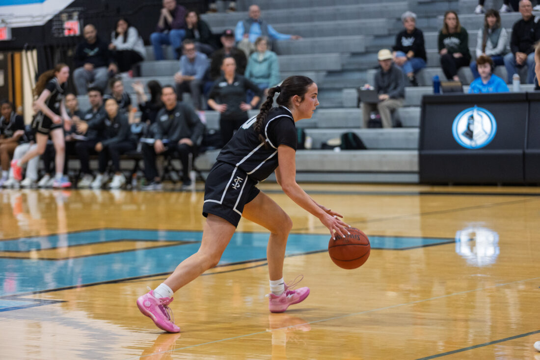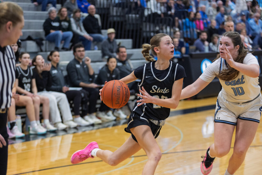 Free State freshman guard Morgan McClorey dribbles forward at Shawnee Mission East High School in Prairie Village on Tuesday, Feb. 17, 2026.