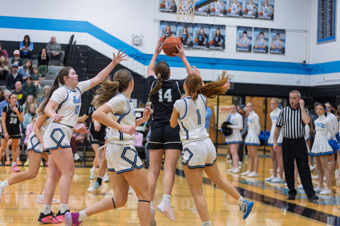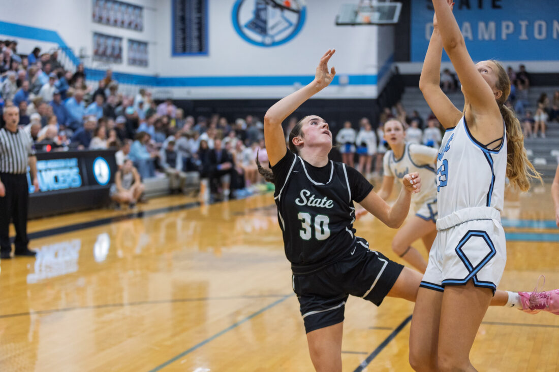 Free State freshman guard Morgan McClorey shoots a hook shot past the Lancers’ defense at Shawnee Mission East High School in Prairie Village on Tuesday, Feb. 17, 2026.
