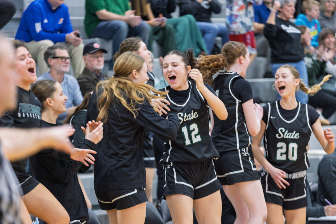 The Free State girls basketball team celebrates on the bench after Sarai Preston hit a 3-pointer at Shawnee Mission East High School in Prairie Village on Tuesday, Feb. 17, 2026.
