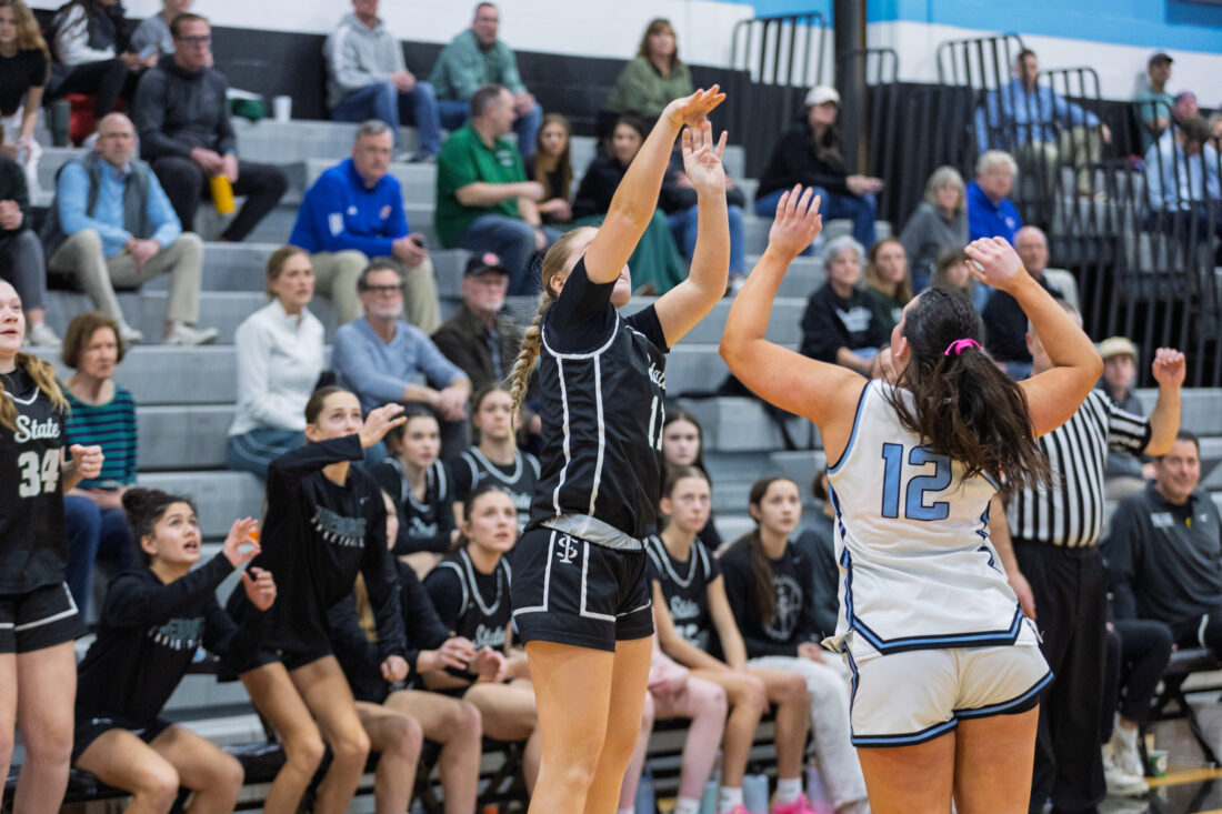 Free State senior guard Libby Easter shoots a 3-pointer at Shawnee Mission East High School in Prairie Village on Tuesday, Feb. 17, 2026.