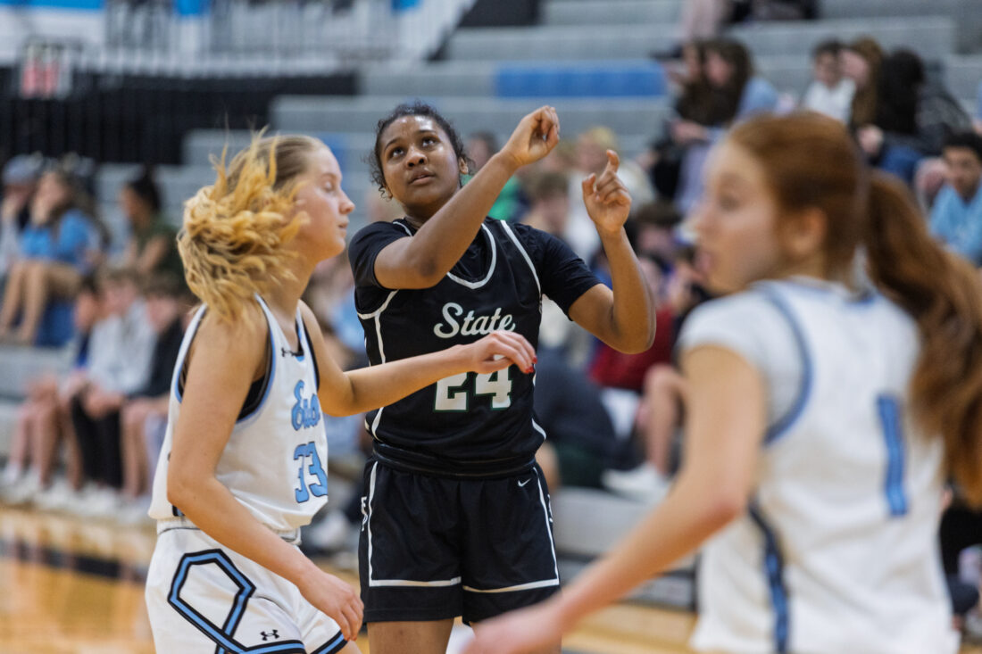 Free State junior forward Sarai Preston watches her shot after a 3-pointer at Shawnee Mission East High School in Prairie Village on Tuesday, Feb. 17, 2026.