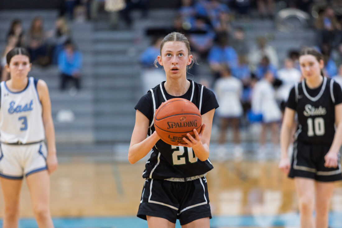 Free State freshman guard Taylor Hulcher prepares to shoot a free throw at Shawnee Mission East High School in Prairie Village on Tuesday, Feb. 17, 2026.