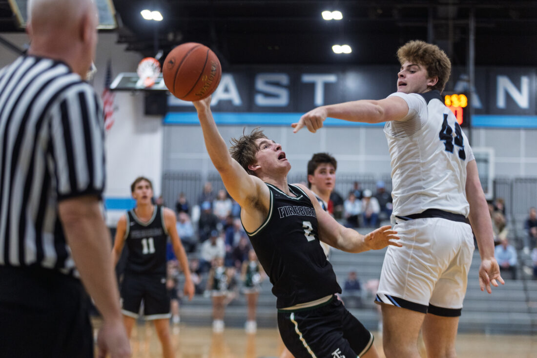 Free State senior Ethan Prescott gets blocked attempting a layup at Shawnee Mission East High School in Prairie Village on Tuesday, Feb. 17, 2026.