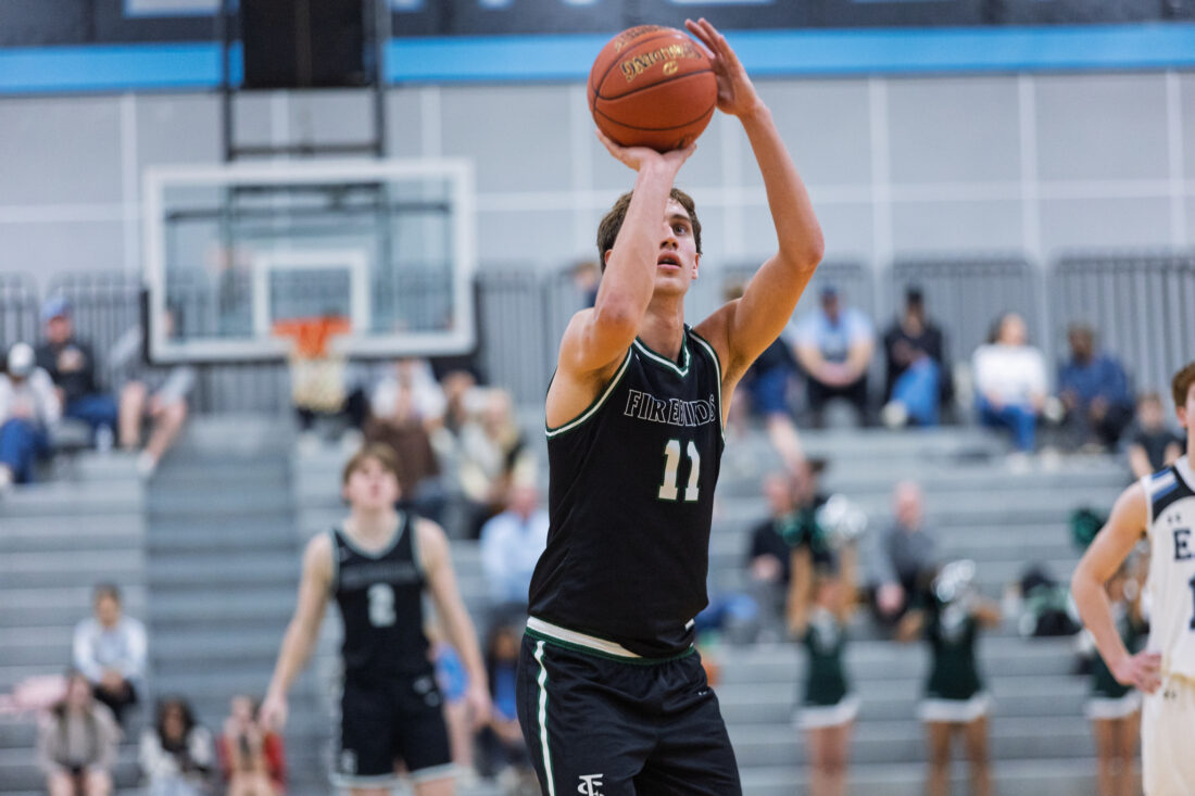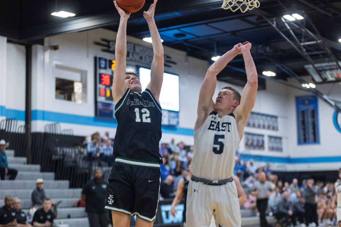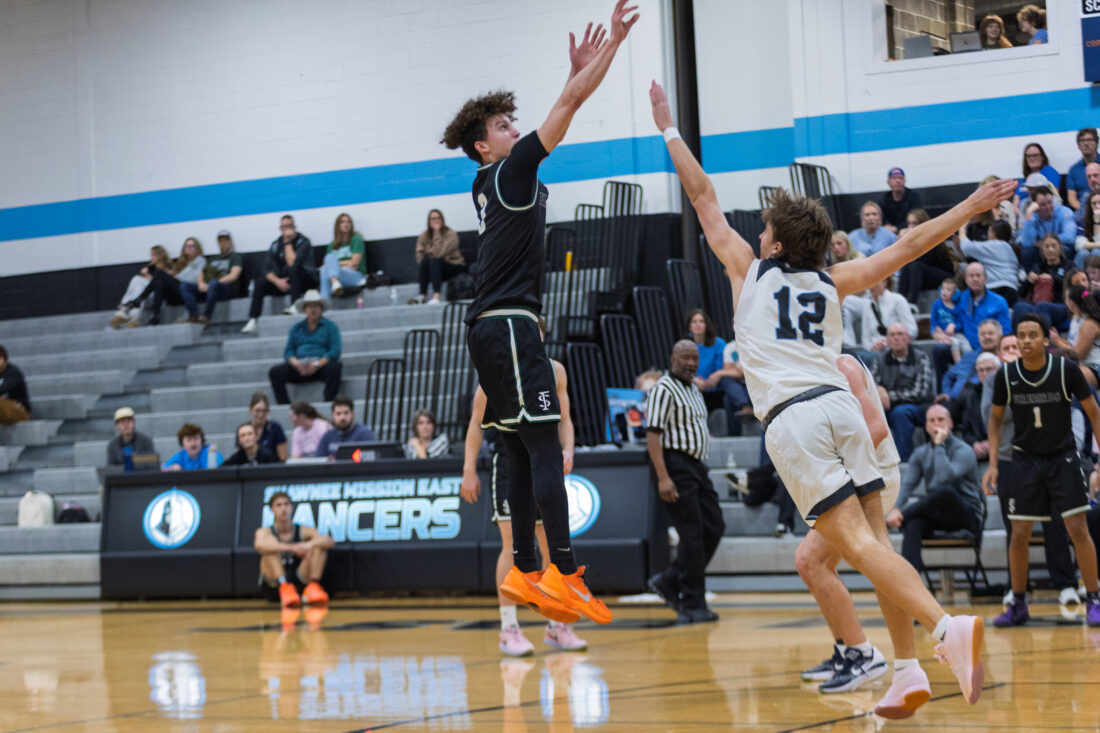 Free State sophomore Brendan Barrett shoots over the Shawnee Mission East defense at Shawnee Mission East High School in Prairie Village on Tuesday, Feb. 17, 2026.