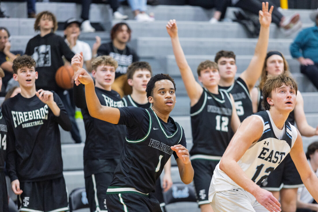 Free State sophomore Jayden Williams shoots a 3-pointer while the Free State bench cheers at Shawnee Mission East High School in Prairie Village on Tuesday, Feb. 17, 2026.