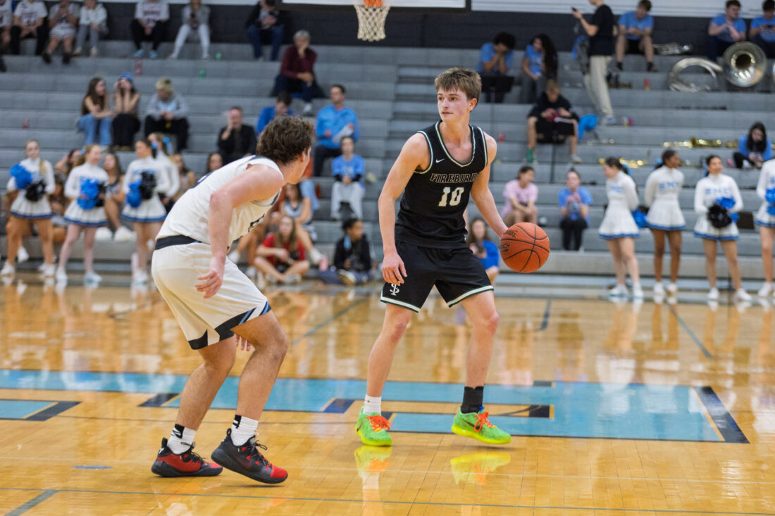 Free State sophomore Brendan Barrett drives past the Shawnee Mission East defense in the paint at Shawnee Mission East High School in Prairie Village on Tuesday, Feb. 17, 2026.