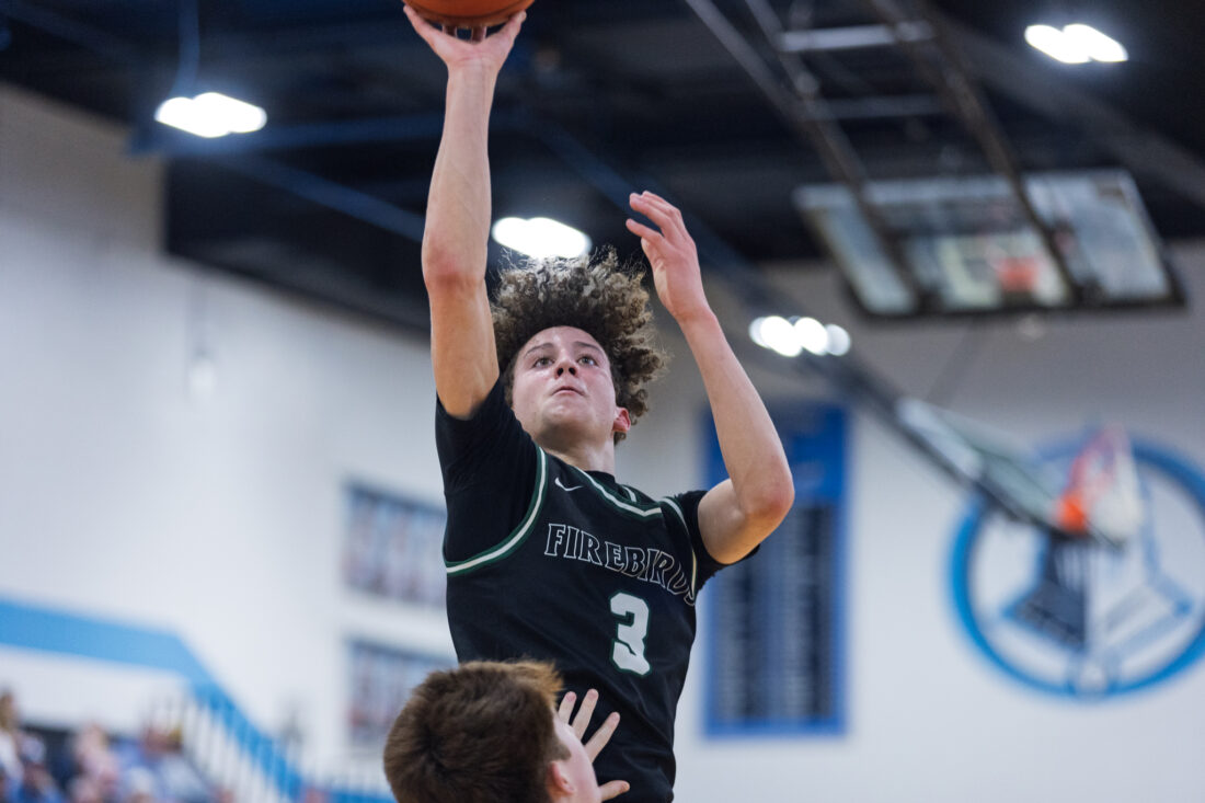 Free State sophomore Brayden DeBruin shoots at Shawnee Mission East High School in Prairie Village on Tuesday, Feb. 17, 2026.