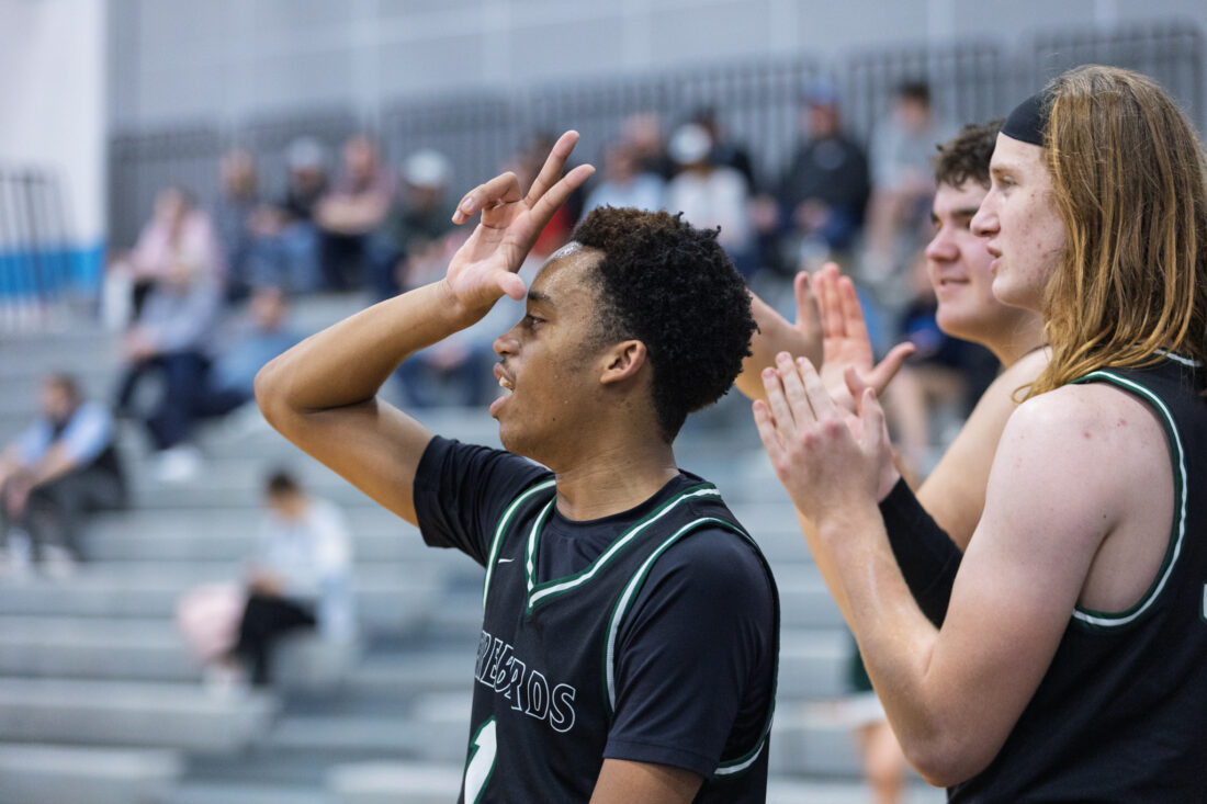 Free State sophomore Jayden Williams makes a gesture on the bench after a teammate scored a 3-pointer at Shawnee Mission East High School in Prairie Village on Tuesday, Feb. 17, 2026.