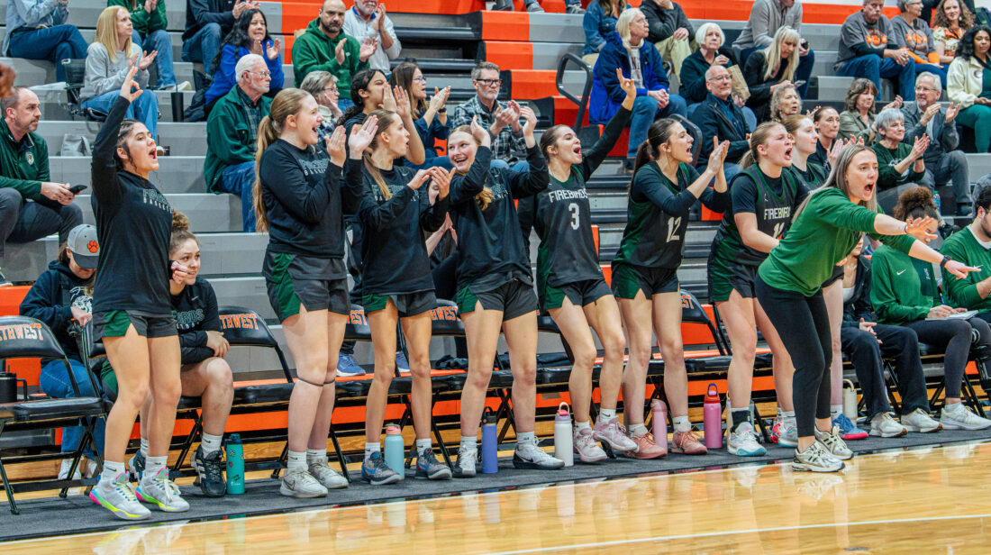 The Free State bench celebrates after a 3-pointer during the game against Shawnee Mission Northwest on Tuesday, Feb. 24, 2026, in Shawnee.