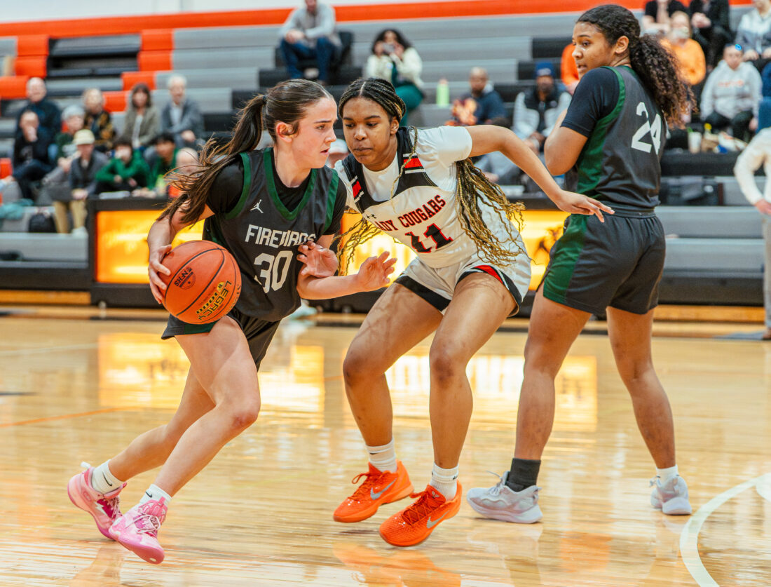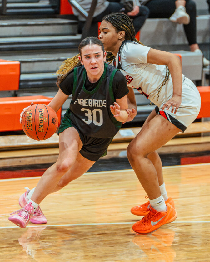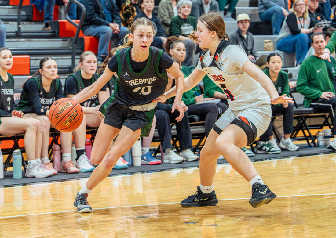 Free State guard Morgan McClorey fights past her defender during the game against Shawnee Mission Northwest on Tuesday, Feb. 24, 2026, in Shawnee.