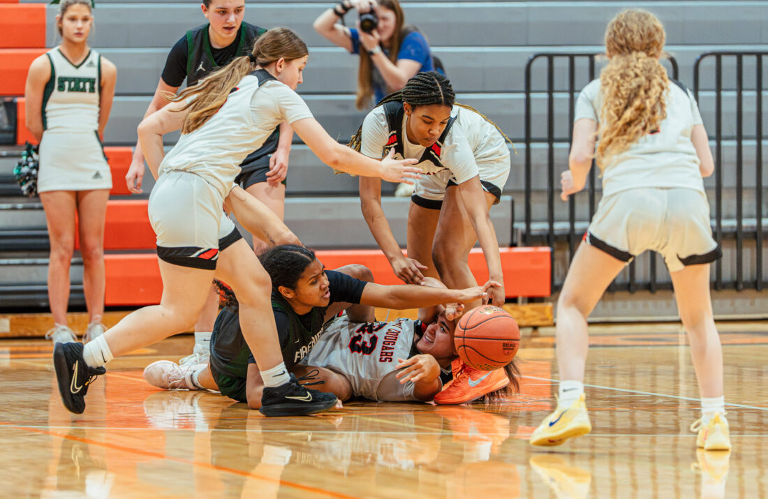 Free State forward Sarai Preston dives for a loose ball during the game against Shawnee Mission Northwest on Tuesday, Feb. 24, 2026, in Shawnee.