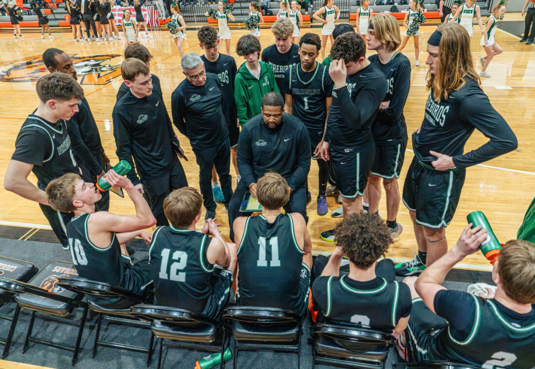 Free State coach Dwayne Paul talks to his team during a timeout in the game against Shawnee Mission Northwest on Tuesday, Feb. 24, 2026, in Shawnee.