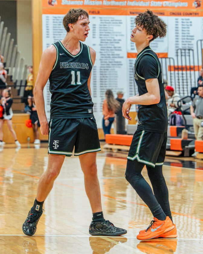 Free State forward Bennett Nagel celebrates with Free State guard Brendan Barrett after a 3-pointer during the game against Shawnee Mission Northwest on Tuesday, Feb. 24, 2026, in Shawnee.