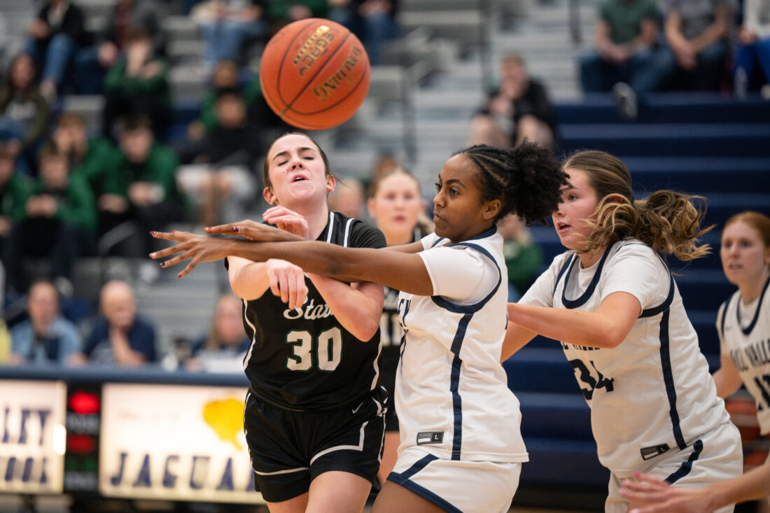 Free State freshman Morgan McClorey passes the ball to a teammate during the game at Mill Valley on Friday, Feb. 27, 2026 in Shawnee.