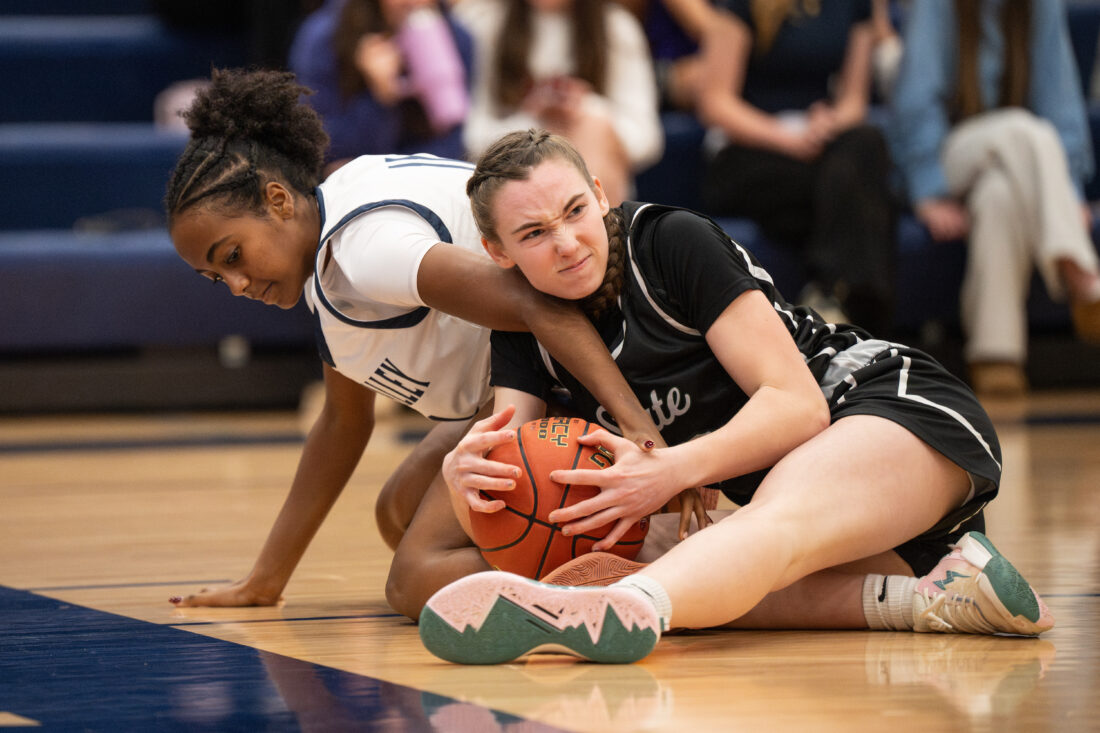 Free State junior Mallary Hice goes to the ground for a jump ball at Mill Valley on Friday, Feb. 27, 2026 in Shawnee.